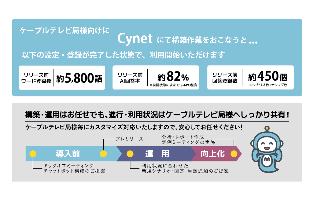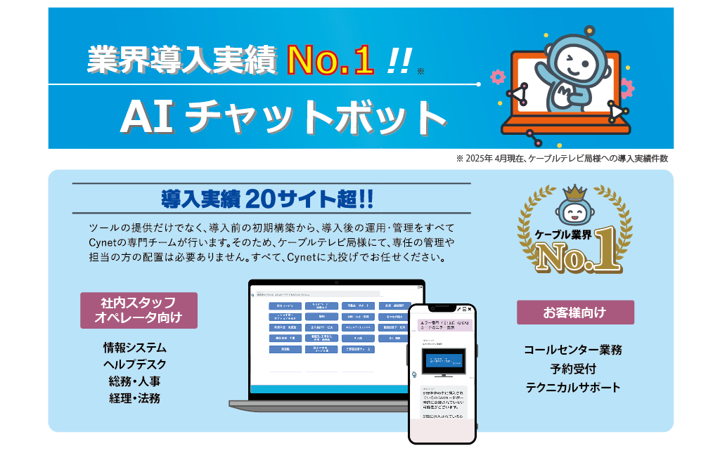 当社のチャットボットは契約者(顧客)・社内スタッフからの問い合わせをAIを活用して自動化する、ケーブルテレビ事業者様向けに強みを持つクラウド型、チャットボットサービスです
