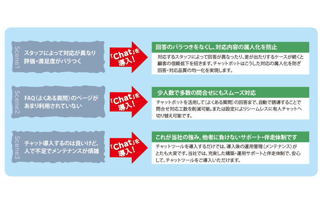 AIチャットボットの主な特徴![]() 自然言語処理技術により、ユーザーの質問の意図を理解し、適切な返答を生成します。 ![]() 24時間365日、いつでもどこからでも的確な対応を提供することで、顧客からのアクションを取りこぼすことなく、顧客満足度を高めることが可能です。 ![]() 過去の会話履歴やデータを学習することで、より的確な応答やパーソナライズされた対応が可能になります。 ![]() 顧客(問い合わせ)対応や情報検索、収集などの業務を自動化し、業務効率を向上させます。 ![]() 人件費や業務コストを削減し、費用対効果を高めます。 ![]() カスタマーサポート、情報検索、予約受付、社内ヘルプデスクなど、様々な分野で活用されています。 お 客 様 の 声 |