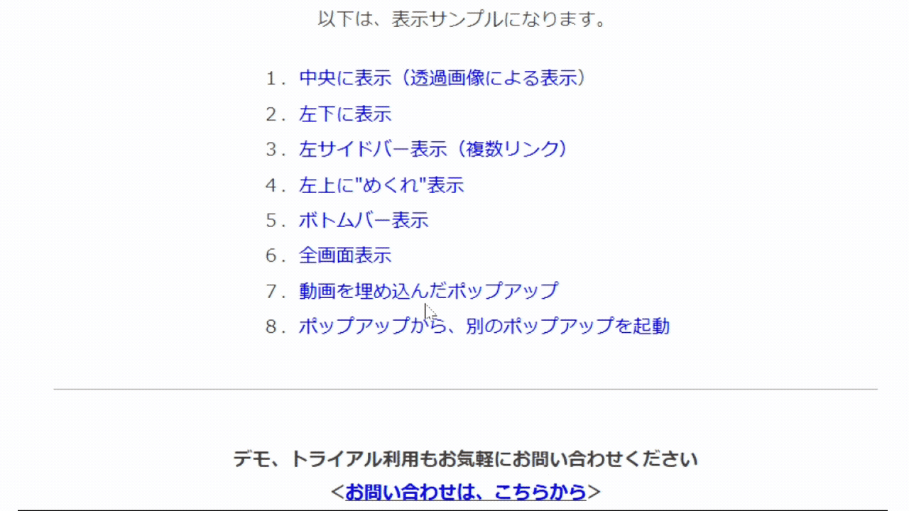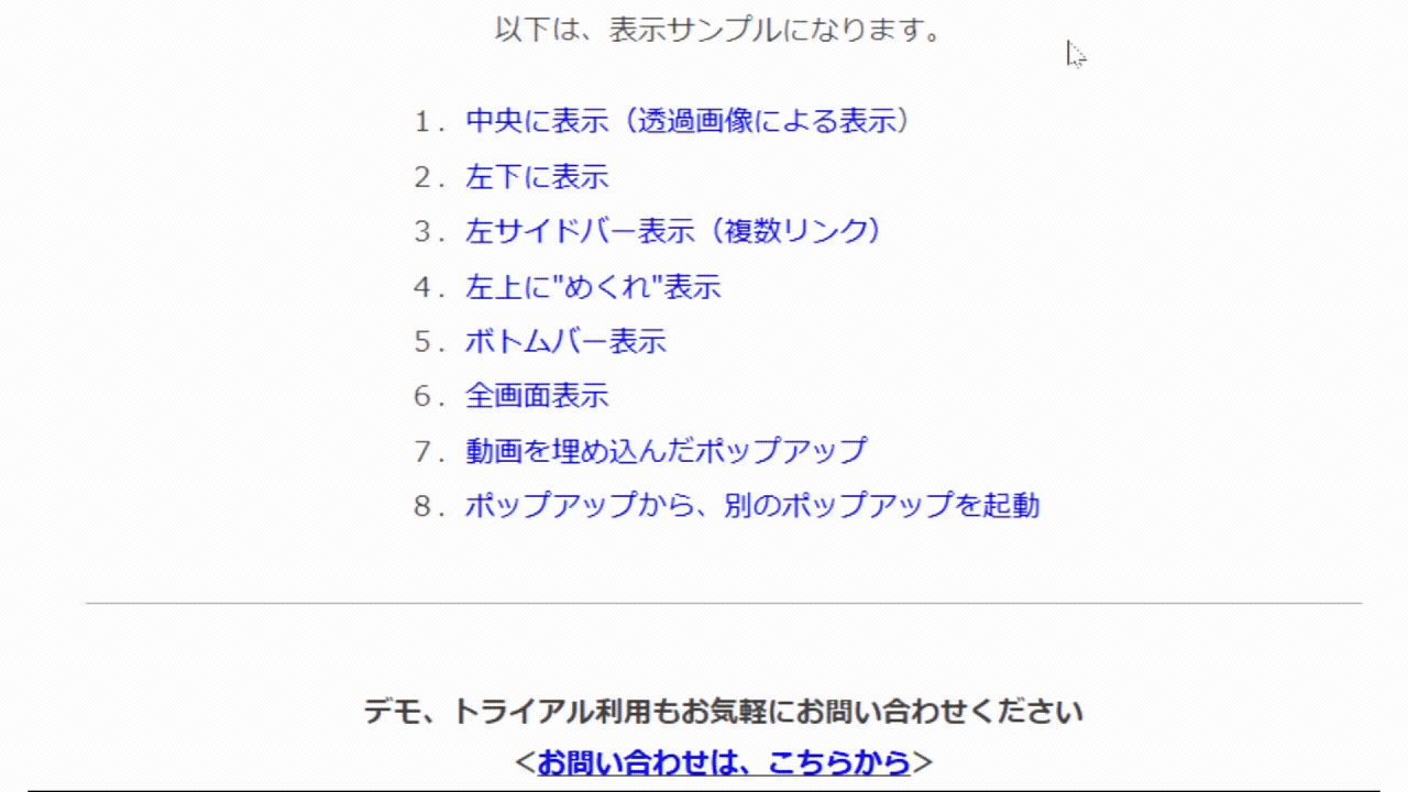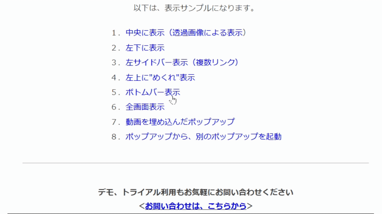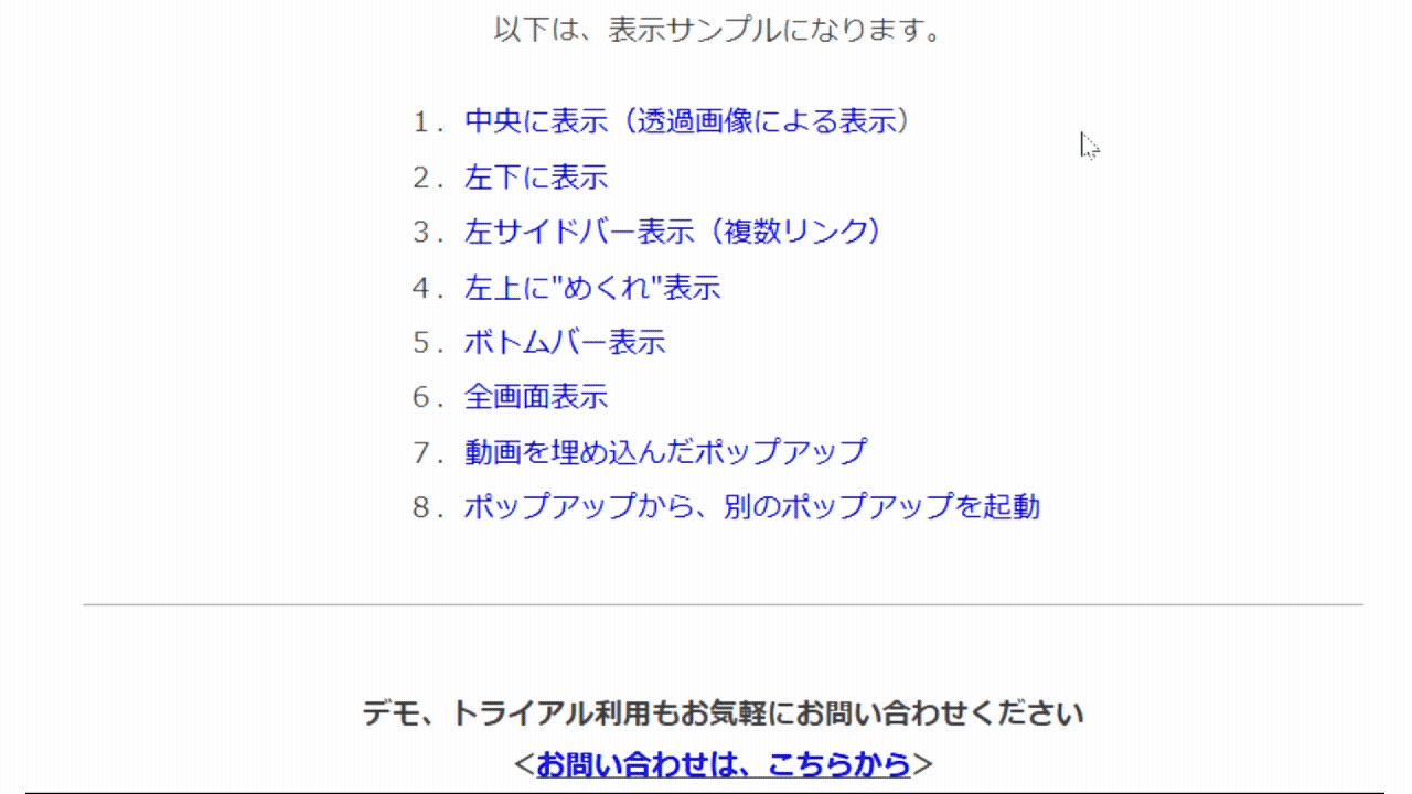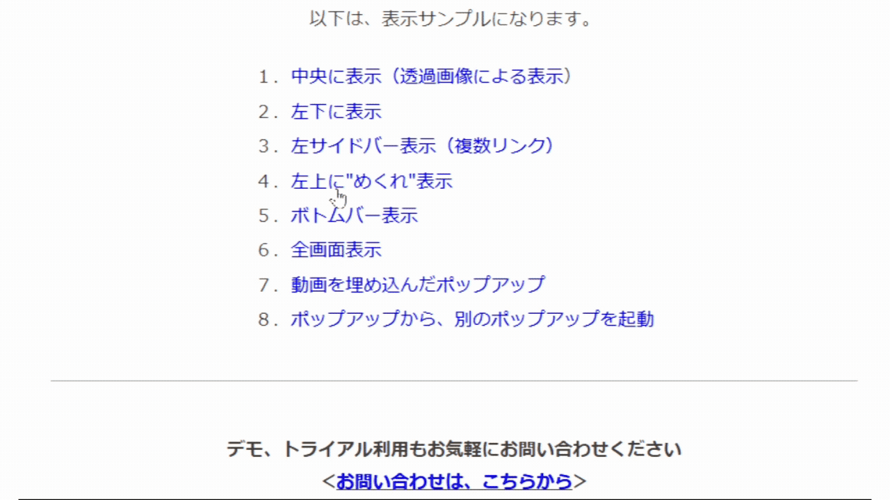 ポップアップツールは、多様なデザインのものを多様な表示トリガーにより、ポップさせることが可能です。また、消去タイミングの設定も豊富です。