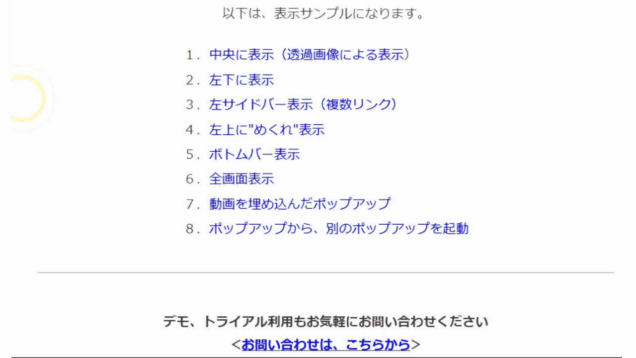 ![]() プロや初心者に限らず、作り手のスキルを選びません。数多くのテンプレートをご用意しています。 数回のクリックですべての作業が完了します。 ストックイメージや画像編集ツールを駆使すれば、デザイナーでなくともDIYでサイトを彩る美しいポップアップの作成が可能です。 ![]() 適切なメッセージを適切なタイミングで表示します。 ポップアップ表示は、サイト・ページ訪問時、離脱時、時間遅延、スクロール、クリック時、曜日・時間指定など、様々な設定が可能です。 また表示するタイミングだけでなく、初回訪問時のみに表示したり、前回の訪問から1か月以上経過した場合に表示するなどが可能です。 ![]() プロや初心者に限らず、作り手のスキルを選びません。数多くのテンプレートをご用意しています。 数回のクリックですべての作業が完了します。 ストックイメージや画像編集ツールを駆使すれば、デザイナーでなくともDIYでサイトを彩る美しいポップアップの作成が可能です。 様々な表示方法クリックすると、実際にサンプルが、ポップアップします。 ※ Poptin LTDとの契約のもと、ポップアップツールとして、poptin を取り扱っております。 |