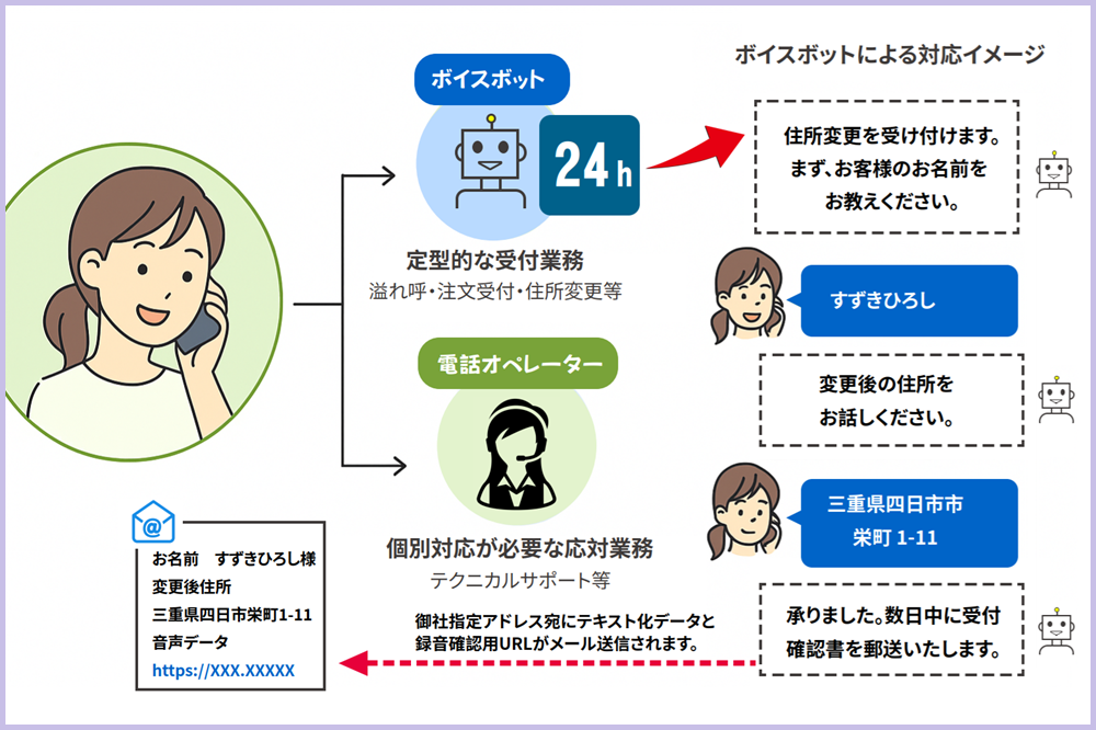 ![]() 着信の集中による取りこぼしの削減が可能です。。 ![]() 支払方法や名意義変更などの均一的な対応を自動化し人件費の削減が可能です。 ![]() スタッフ(オペレーター)をマンネリ業務から解放します。 ![]() AWS と Google Gemini の 生成 AI を活用し、吹き込まれた音声をほぼリアルタイムでテキスト化して、ご指定のアドレス宛にメールします。 メール内に記載された、URL から、音声データを確認いただく事も可能です。 |